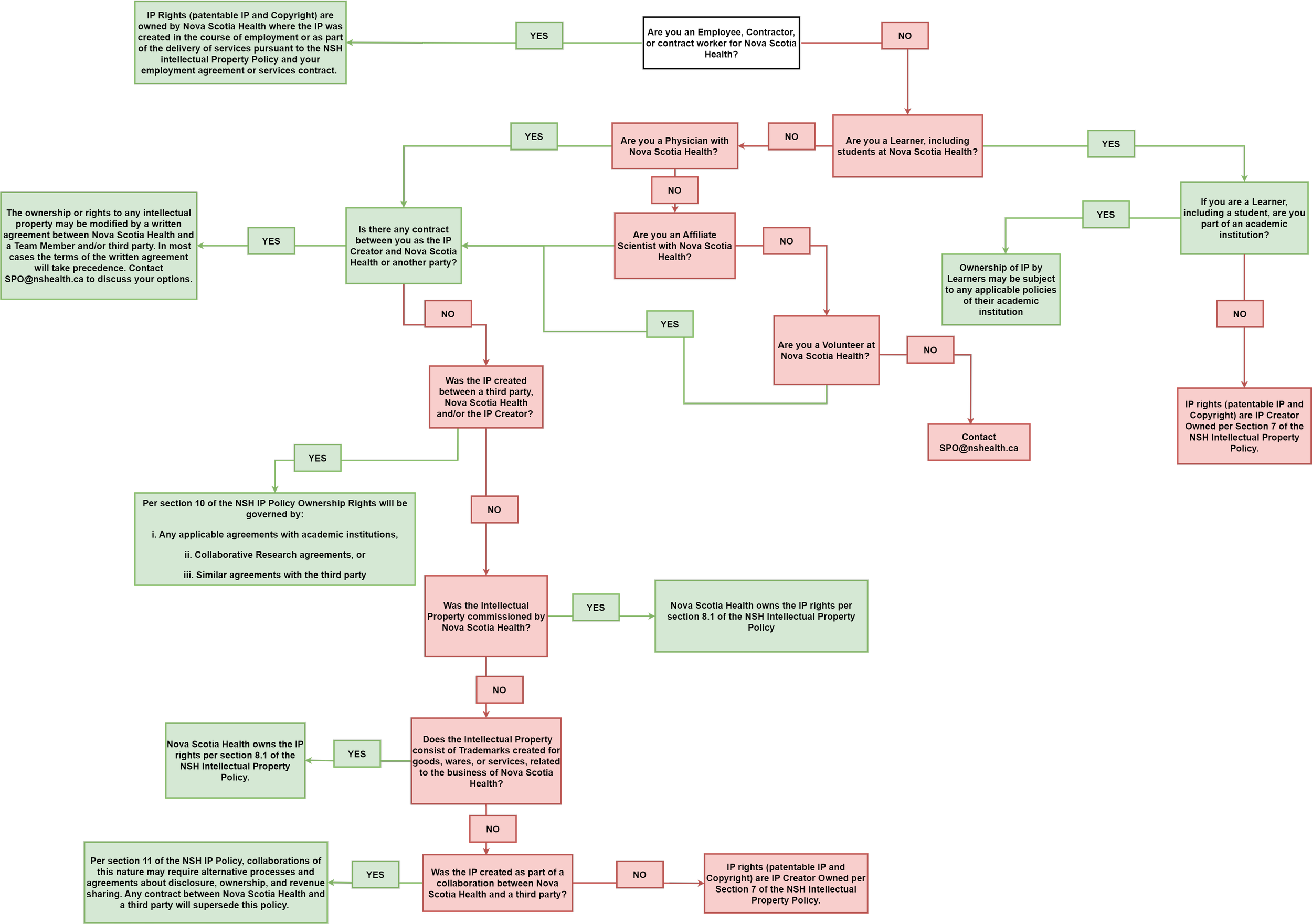 Ownership of Intellectual Property created by Nova Scotia Health Team Members is determined by type of IP creator, circumstances of the IP creation, and any current or pre-existing agreements that impact IP ownership. The questions and flow-chart are intended to provide a guide to determining ownership based on the available information. This is not intended to be a final or binding decision and further investigation will be necessary.